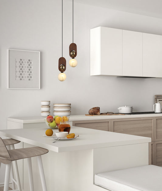 PALTA: Interior Sandblasted Opal Diffuser with Brass & Wood Highlight Pendant Lights