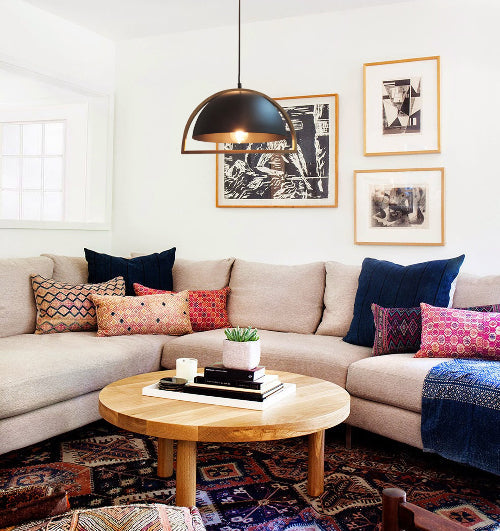 TAMBURA: Scandinavian Medium Drum Cloth Shade with Wood Veneer Trim Pendant Lights