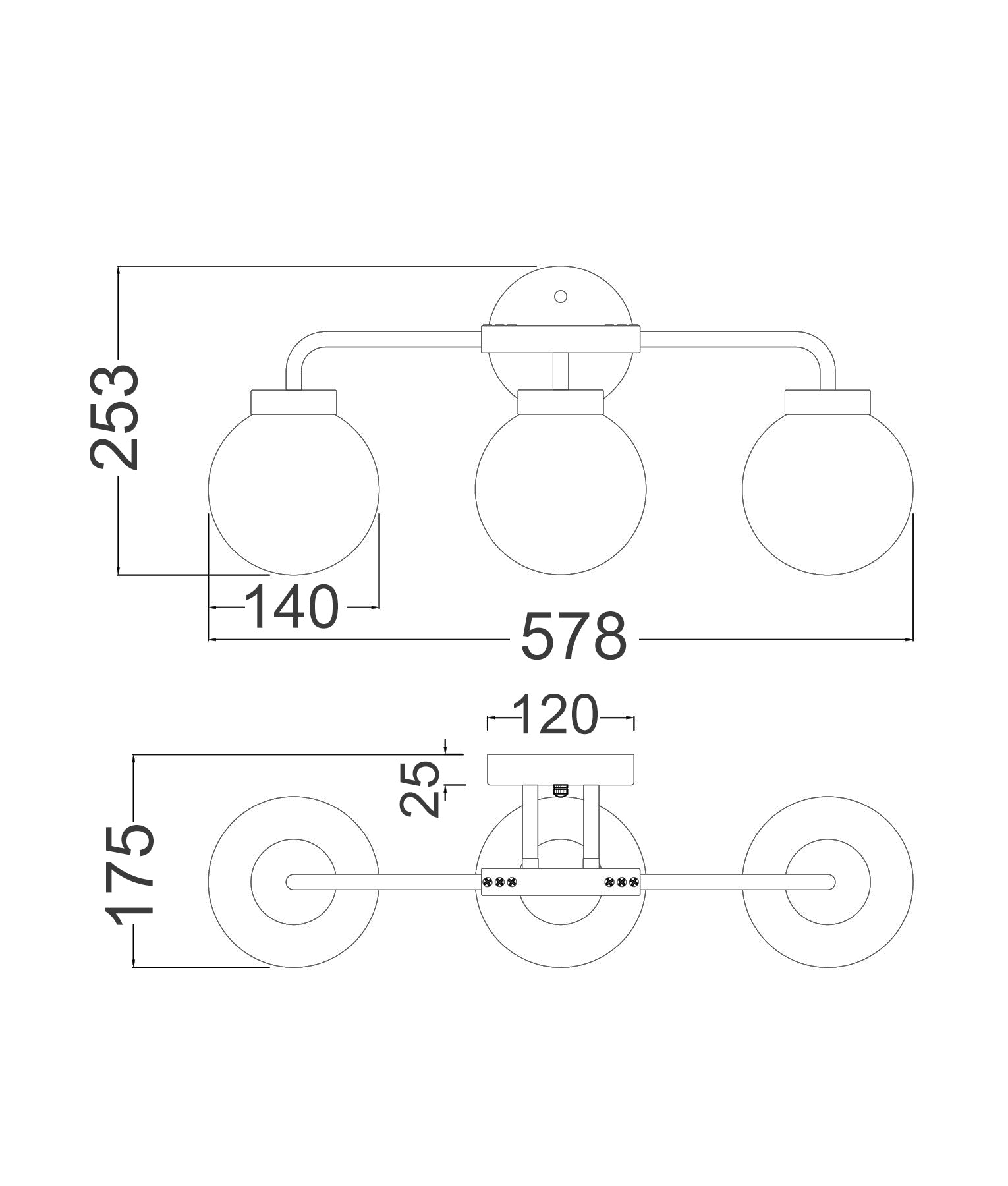 Description: WALL INTERNAL S/M ES 40W 3 x White Marble SPHERE w/Brass Finish (RND Base & Highlight) H253mm x W580mm x D174mm (Sphere OD140mm) WTY 1YR